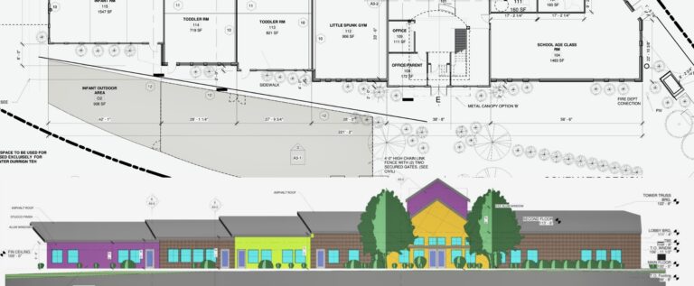 Construction documents for a child daycare center. The cascading plan was designed to reflect the age groups of children housed by the facility. The design reflects an emphasis on simplicity, and ease of operation.